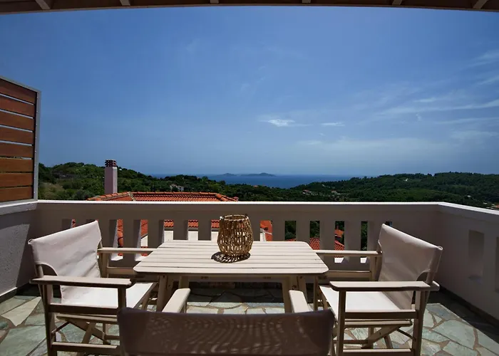 דירת Casa Aeria Old Town Sea View Alónnisos זהו נכס בעל 1 חדרי שינה עם חצר ופטיו וכמו כן גם עם נופים של חצר פנימית. האורחים יכולים להרפות בתוך מרפסת.